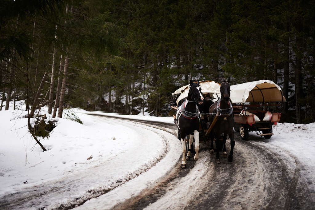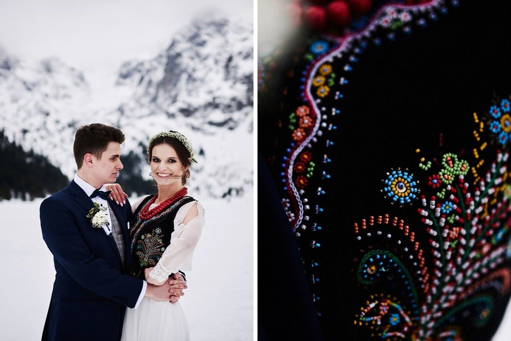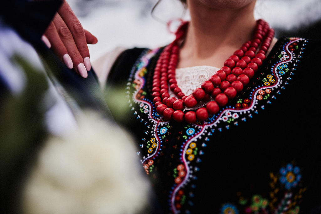 Trasa nad nad Morskie Oko nie jest wymagająca. Natomiast, kiedy masz na sobie długą, białą suknię, garnitur, niesiesz bukiety- naprawdę nie jest łatwo. Początkowo, upieraliśmy się przy tym, że nie skorzystamy z przejazdu konnego ( przecież jesteśmy proekologiczni). Ostatecznie, na samą górę wywiózł nas powóz konny. Dzięki temu zaoszczędziliśmy czas, który tego dnia był naprawdę cenny. Nie mogło obyć się bez motywu słowiankowego, dlatego na zdjęciach zobaczycie Monikę w gorsecie oraz pięknych, czerwonych koralach.